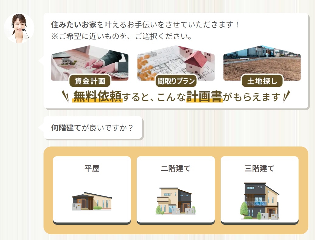 あなたの家づくりの理想・叶えたい間取りを伝えることで、オリジナルの家づくり計画書(間取り・土地情報・資金計画書)を無料で提供してもらえます。
